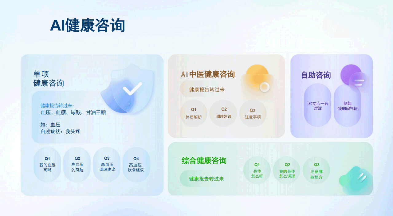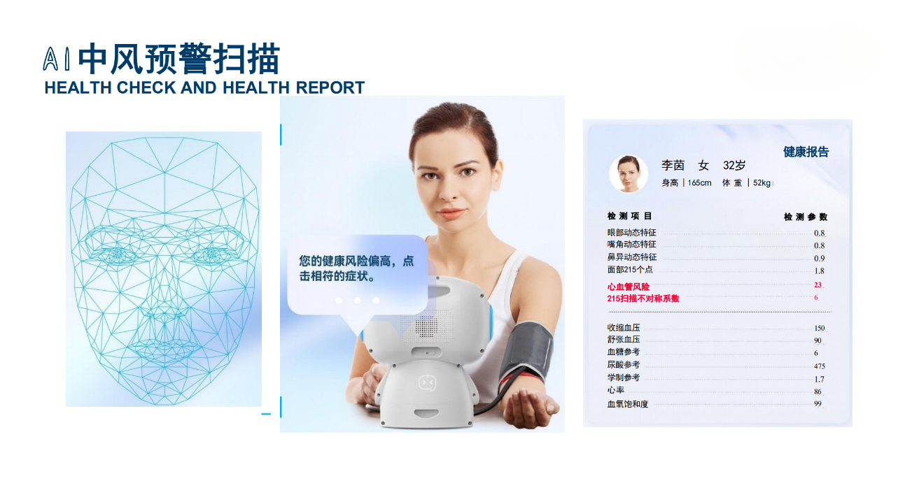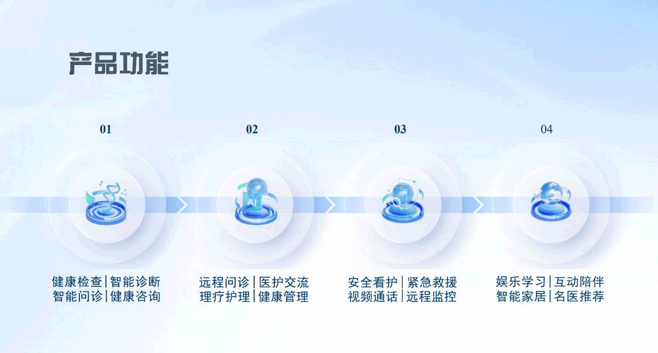 健康检查|智能诊断|智能问诊|健康咨询|娱乐学习|互动陪伴|智能家居|名医推荐|远程问诊|理疗护理|紧急救援|远程监控|医护交流|健康管理|安全看护|视频通话