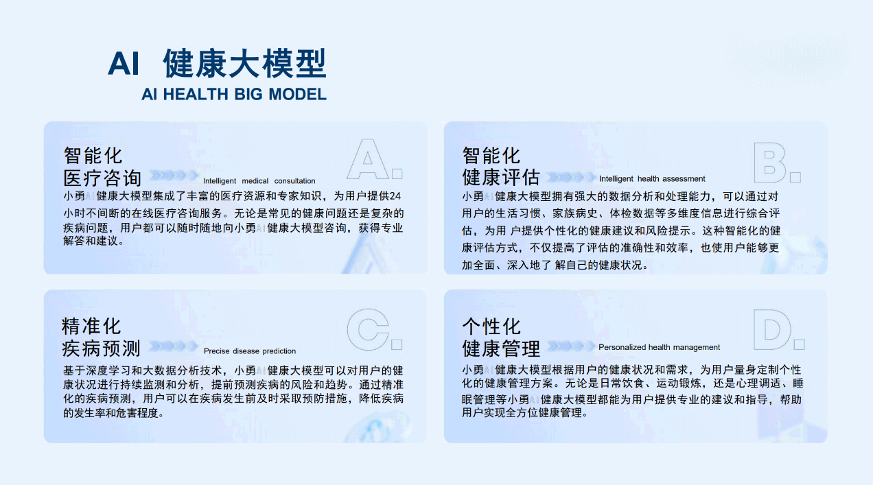 正是在这样的时代背景下,小新AlI健康体系平台应运而生。我们致力于通过人工智能的神奇力量,为基层医疗注入智慧化 元素。托最前沿的AI技术与海量权威医学知识,打造覆盖家庭、社区、医疗、养老和政府的全方位智能化医护体系。”让优质医护产品惠及中国千万家庭。